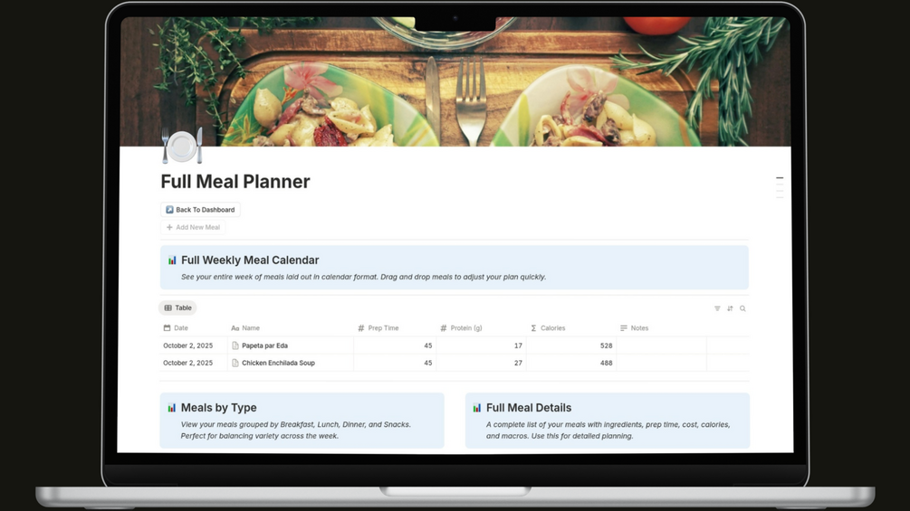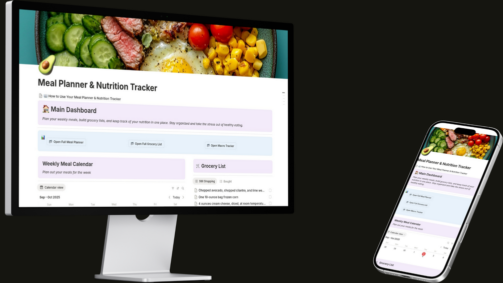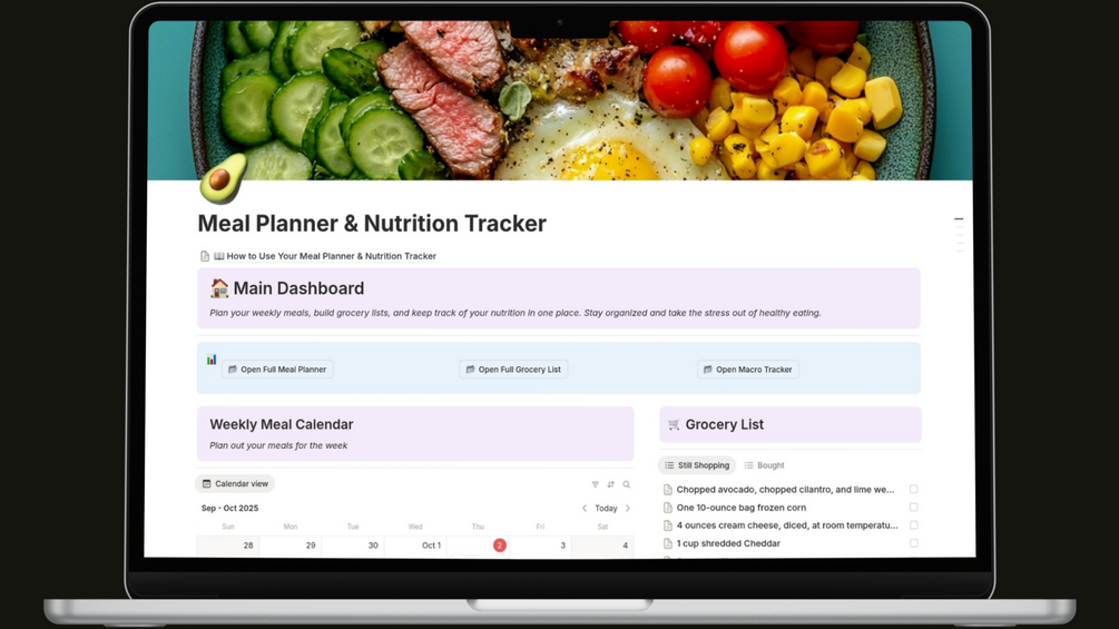 This premium Notion Meal Planner combines meal scheduling with nutrition tracking (calories & macros) and grocery budgeting, and meal planner for busy individuals.