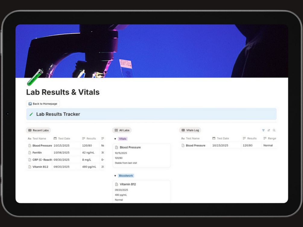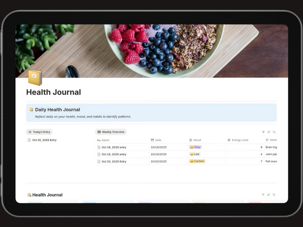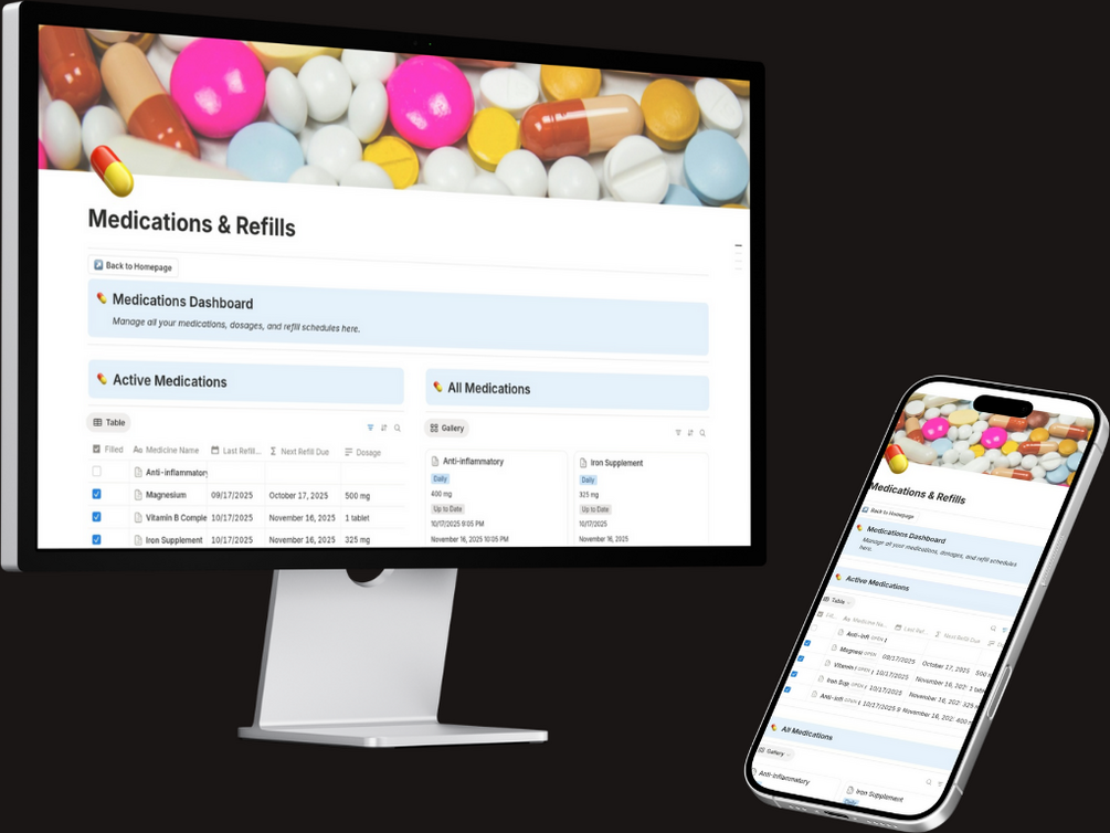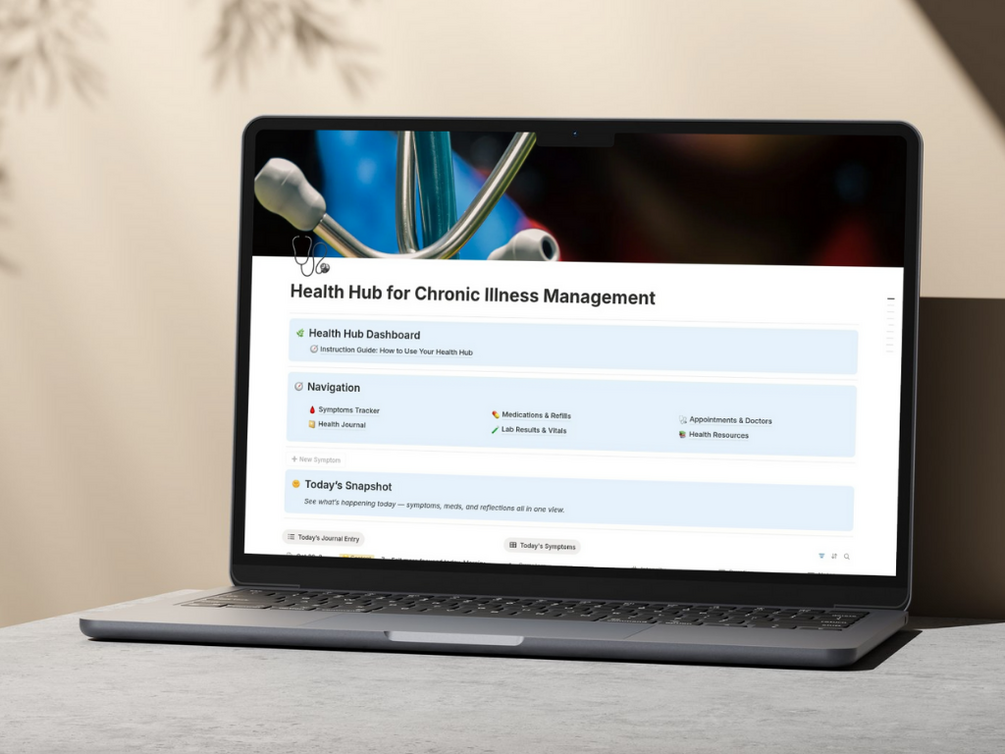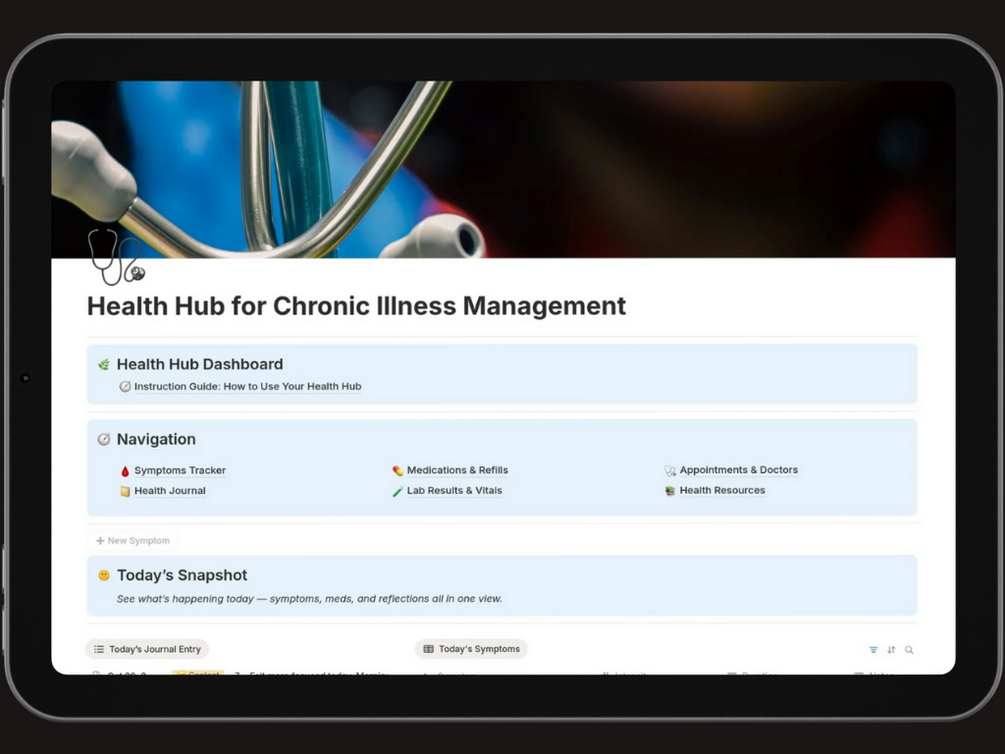 🌿 Health Hub — Chronic Illness Management System (Notion Template) A calm, structured Notion workspace designed to help you manage chronic illness with clarity and compassion. Track symptoms, medications, refills, appointments, and lab results — all in one connected dashboard.